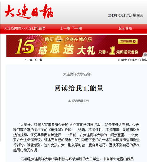 5月16、17日,《大连日报》《大连晚报》分别以“阅读给我正能量”、“在读书中摆脱自卑的女大学生”为题报道小欧视频