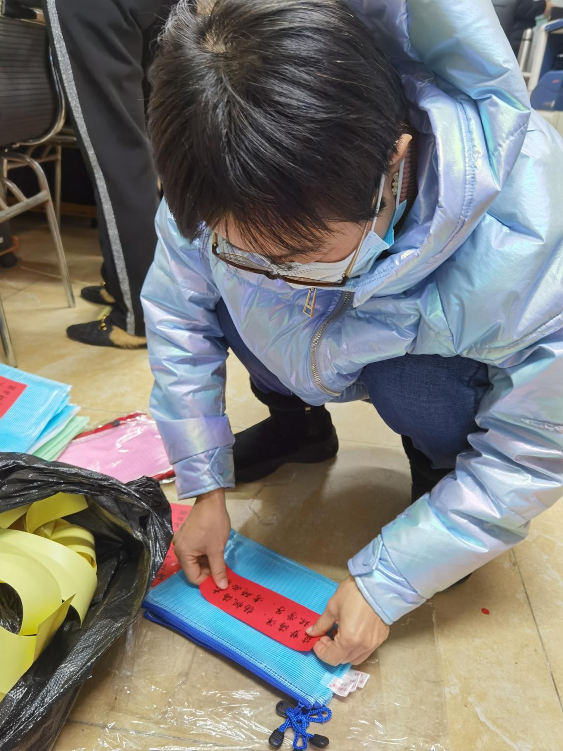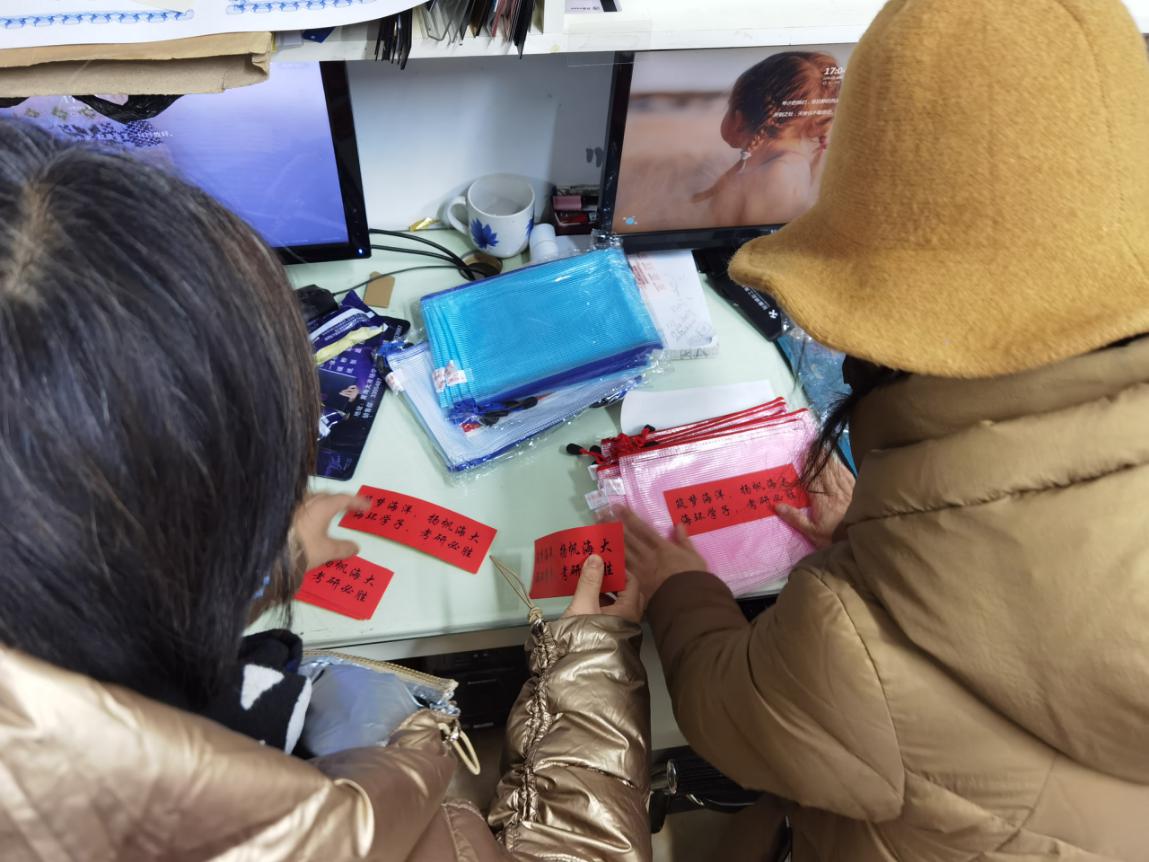 天气再冷也阻挡不了老师们给大家准备应试袋的热情,在寒风中排队检测准备监考的“海师”们,挤出时间细心地为考研宝宝们准备着物品,红红的字条上饱含老师们最深情的祝福!