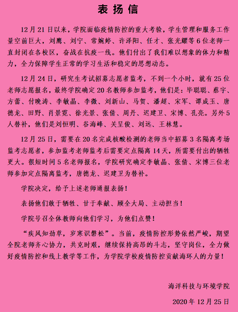为新考点选派监考志愿者的通知发布不到一个小时,学院就有25位老师积极报名,在隔离考场志愿者招募中有5位老师报名,这就是顾全大局,主动担当的海环精神,表扬信走起!