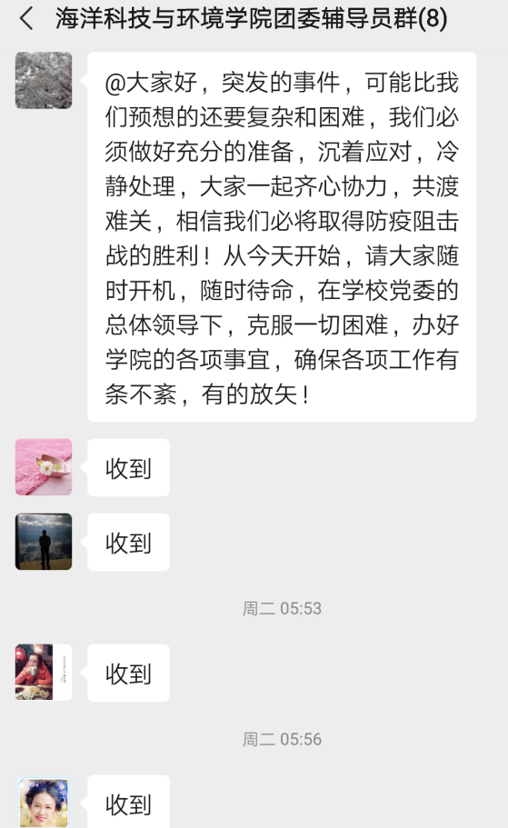 疫情发生后学院领导第一时间安排部署防疫具体工作,院长刘鹰主动隔离在黄海校区陪伴校内500多名学生,党总支书记关呈俊在校外组织学院教师结合防疫要求和学生实际需求即时进行志愿服务活动,党总支副书记刘宁带领4名辅导员驻守在两个校区。