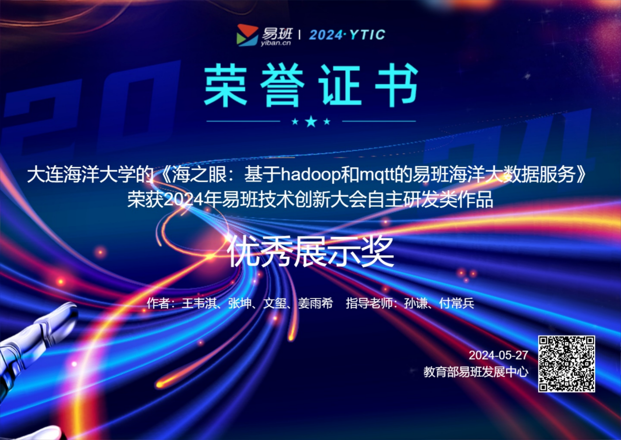 5月24日至27日,2024年全国高校易班技术创新大会在海南陵水举行。我院团委书记孙谦指导,研究生张坤、文玺、本科生姜雨希提交的作品《海之眼:基于hadoop和mqtt的易班海洋大数据服务》荣获2024年易班技术创新大会自主研发类作品优秀展示奖。