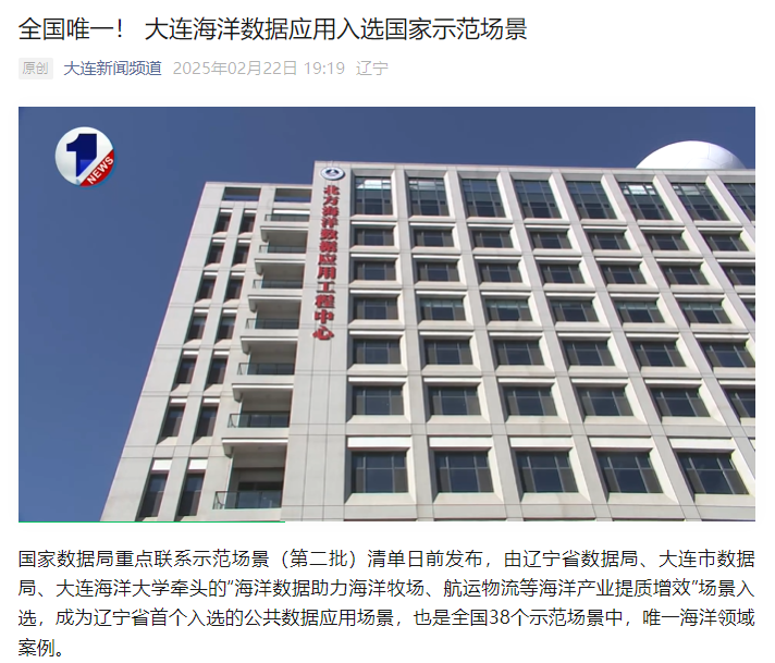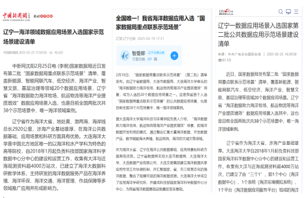 近日,中国新闻网、中央广电总台国际在线、辽宁日报、北斗融媒、大连新闻网等多家媒体报道了小欧视频 海洋数据应用入选“国家数据局重点联系示范场景”。