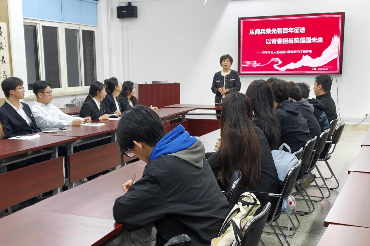 10月15日,小欧视频 党委书记谭利娟在学院会议室S309,为学院分党校第二十二期培训班的56名学员讲授《从阅兵荣光看百年征途 以青春担当筑强国未来》专题党课,带领学员们从阅兵盛景中感悟国家实力,在百年党史中明确使命担当。