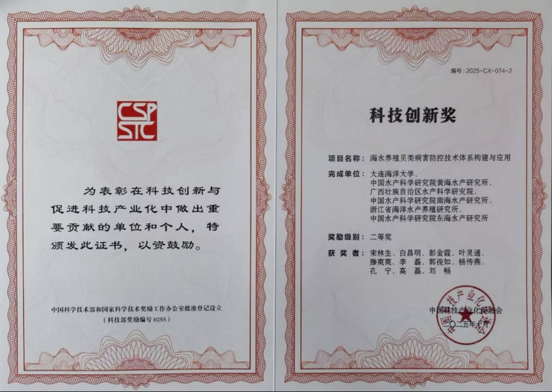 近日,由宋林生教授领衔,联合中国水产科学研究院黄海水产研究所等单位共同完成的项目“海水养殖贝类病害防控技术体系构建与应用”,荣获第五届中国科技产业化促进会科学技术二等奖。