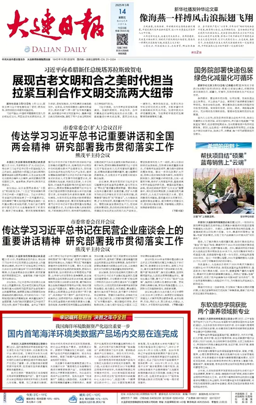 3月14日,大连日报头版以“我国海洋数据资产化迈出重要一步 国内首笔海洋环境类数据产品场内交易在大连完...