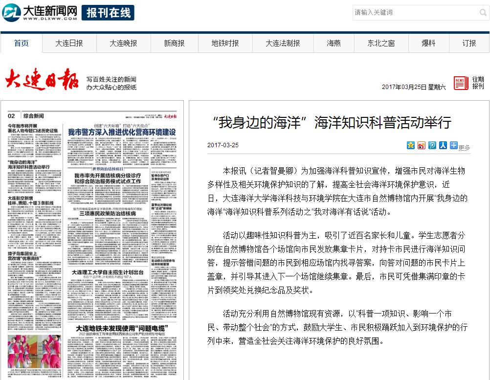 为加强海洋科普知识宣传,增强大连市市民对海洋生物多样性及相关环境保护知识的了解,提高其海洋环境保护意...